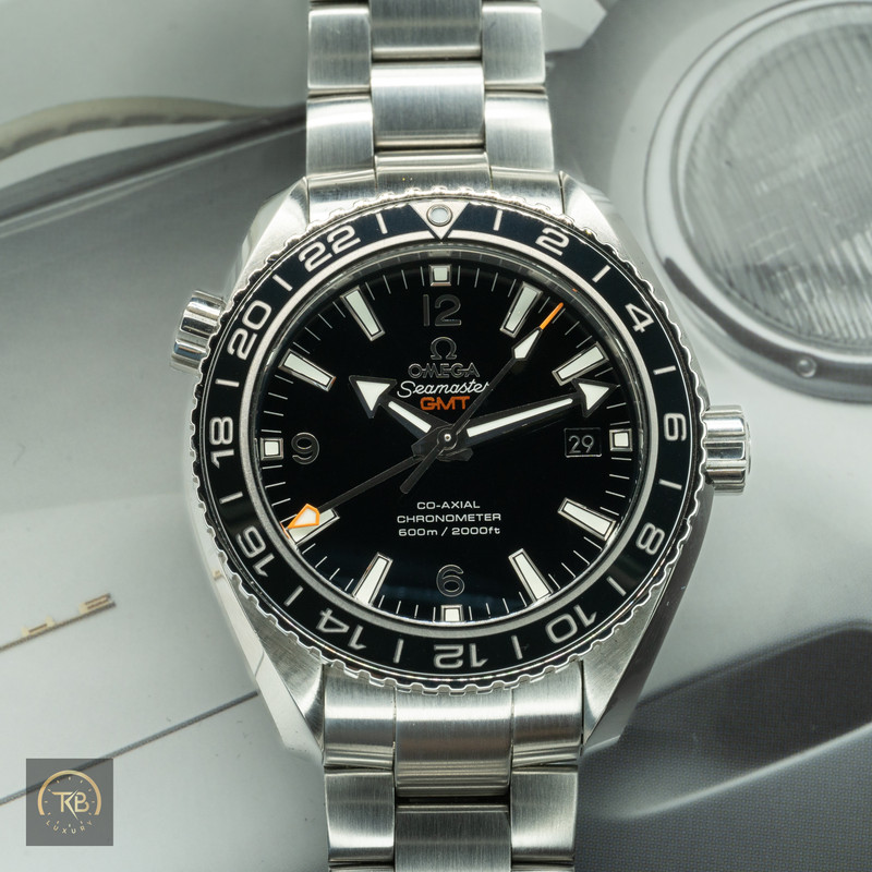 Omega Seamaster Planet Ocean GMT – Ref. 232.30.44.22.01.001 (Black Dial, 43.5 mm) Box and Papers – 2019 – Great Pre-Owned Condition – $4,600 Shipped For sale is the Omega Seamaster Planet Ocean GMT (Ref. 232.30.44.22.01.001) — a robust and highly versatile GMT diver that combines Omega’s advanced Co-Axial technology with the brand’s deep-sea heritage. This model features a 43.5 mm stainless-steel case, black ceramic bezel, and a lacquered black dial with applied markers and broad-arrow hands accented by an orange GMT hand for dual time-zone functionality. Powering the watch is the Omega Co-Axial Calibre 8605, an in-house automatic GMT movement offering a 60-hour power reserve, silicon balance spring, and chronometer certification. A sapphire caseback reveals the beautifully finished movement. The Planet Ocean GMT is water-resistant to 600 m / 2000 ft, making it a true professional-grade diver with added travel practicality. This example is in great pre-owned condition, showing light wear consistent with careful use. The case and bracelet are clean and well preserved, bezel and crystal are flawless, and the movement runs accurately. Originally sold in 2019, complete with box, papers, and manual. FedEx Express Fully Insured Shipping (Within U.S.) Included. Signature required upon delivery. We are passionate collectors with a trusted reputation in the watch community. Every watch we sell is 100 % authentic, accurately described, and securely shipped with full insurance and tracking. Questions welcome — we reply quickly and always enjoy talking watches.