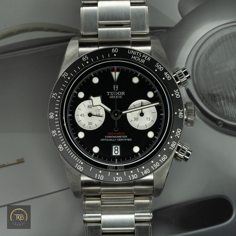 Tudor Black Bay Chronograph “Reverse Panda” – Ref. 79360N (Black Dial, White Subdials) Box and Papers – 2021 – Very Good Pre-Owned Condition – $4,000 Shipped For sale is the Tudor Black Bay Chronograph “Reverse Panda” (Ref. 79360N) — one of Tudor’s most sought-after modern chronographs, pairing the brand’s classic dive watch heritage with the spirit of vintage motorsport design. It features a 41 mm stainless-steel case, black dial with white subdials, and a black fixed aluminum tachymeter bezel, delivering a bold, timeless look with excellent legibility. Inside is the Tudor Calibre MT5813, an in-house automatic chronograph movement developed with Breitling’s B01 architecture. It offers a 70-hour power reserve, column-wheel mechanism, and COSC chronometer certification, ensuring precision and reliability. Water-resistant to 200 m and mounted on a stainless-steel bracelet with folding clasp, this Black Bay Chrono combines durability, performance, and refined design. This example is in very good pre-owned condition, showing minimal wear from gentle use. The case and bracelet are sharp with crisp edges, the bezel and crystal are clean, and the movement runs accurately. Originally sold in 2021, and complete with box, papers, and manuals. FedEx Express Fully Insured Shipping (Within U.S.) Included. Signature required upon delivery. We are passionate collectors with a trusted reputation in the watch community. Every watch we sell is 100 % authentic, accurately described, and securely shipped with full insurance and tracking. Questions welcome — quick replies and always happy to talk watches.